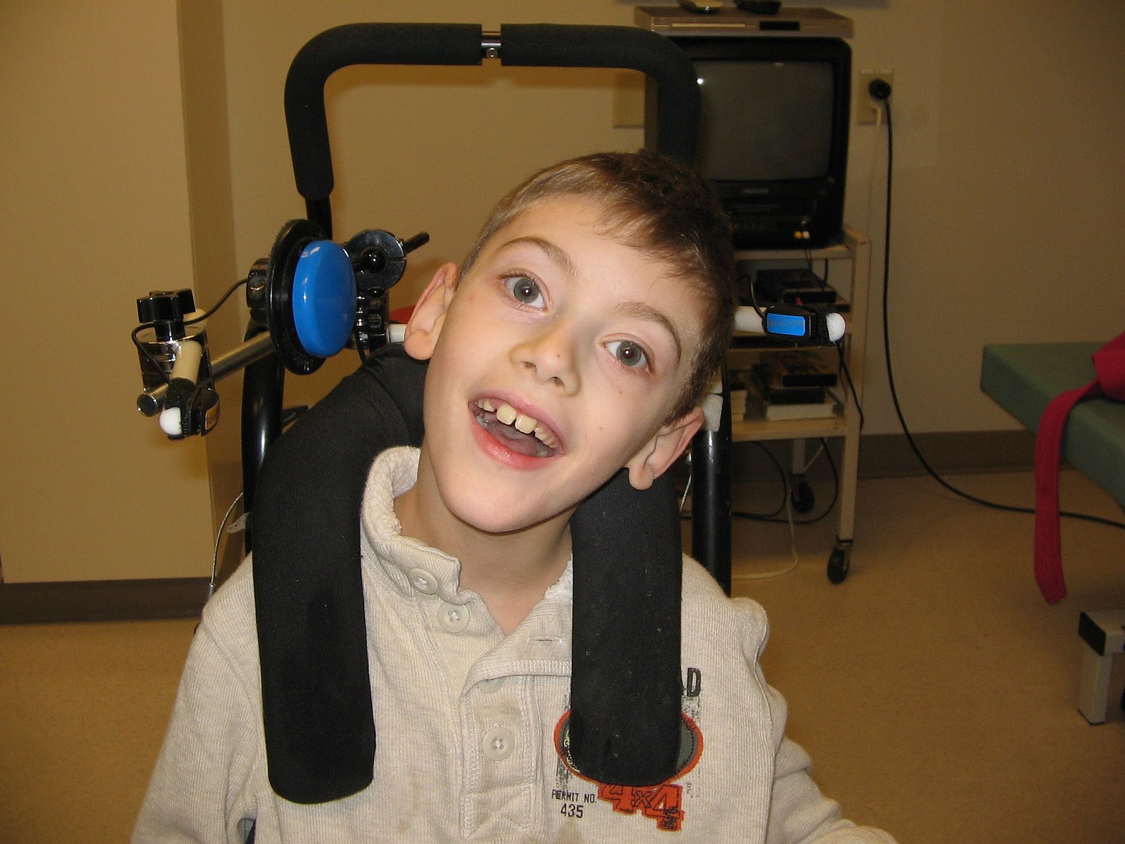 Ethan Scott is a young student who has recently started step scanning with a Dynavox V using Speaking Dynamically Pro software. He is learning to use an auditory scan and three head switches. He uses his first switch (blue jelly bean switch on his right) to "move" between his choices and when he hears his choice he "picks" it with his second swtich (small orange ultralite switch on his right). Ethan is even using a third switch to indicate he's made a mistake. This "oops" switch (blue ultralite switch on his left), starts the scan over again. Ethan has so much vocabulary that it is "grouped" in categories that allow him to access information more quickly.
