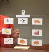 When you first start introducing eye gaze, you can hold up two objects or pictures for the person to choose between. As you increase the number of choices offered, it may be beneficial to present the symbols on an eye gaze frame.