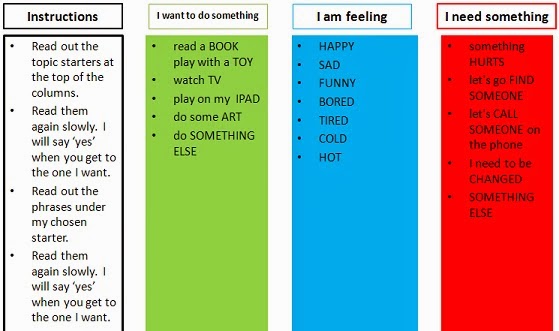 Partner assisted scanning relies heavily on the communication partners providing access to the vocabulary needed. Even though, it may take a bit longer to get to a particular message by going through each message, you provide the chance for that child to say something perhaps you didn't anticipate like, "I'm bored" or "I think you're funny". Having a the vocabulary laid out so that each communication partner is providing the same choices, helps provide that opportunity.